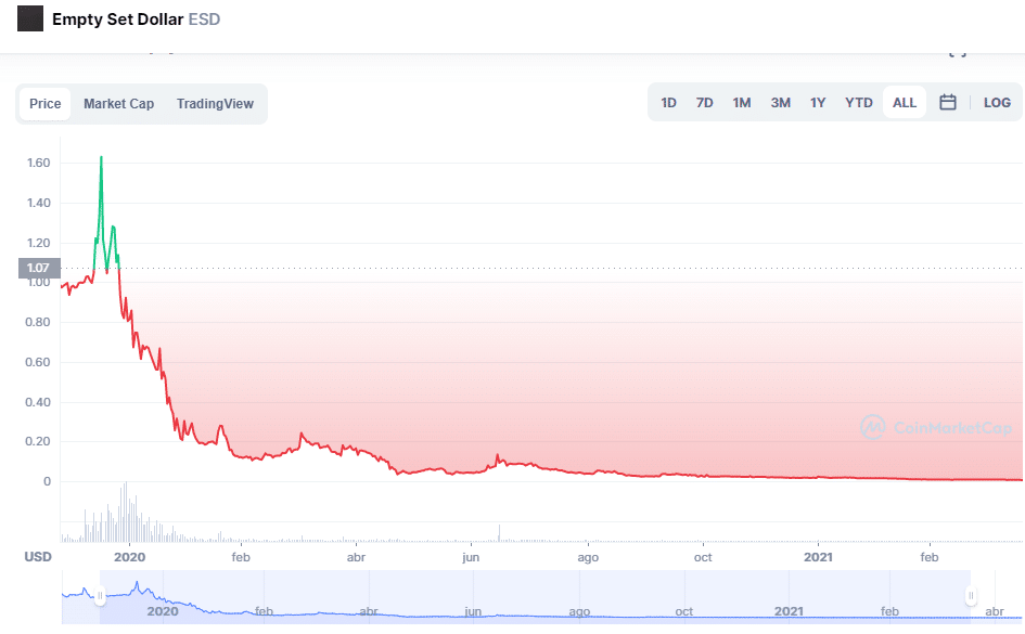 No obstante, Terra USD no es la primera stablecoin algorítmica que colapsa, también hay otras como, por ejemplo, Empty Set Dollar, o ESD.