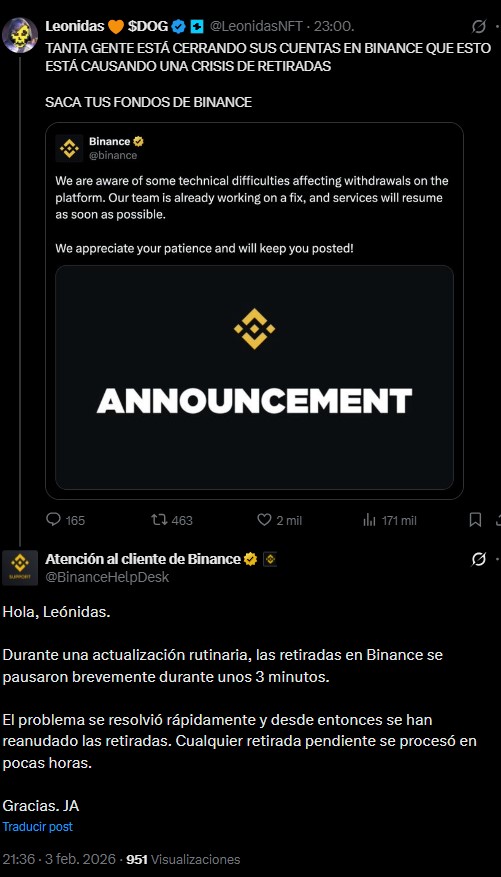 Ante la alarma, la propia plataforma aclaró rápidamente la situación. Explicaron que durante una actualización de rutina ejecutada el martes 3 de febrero, los retiros se pausaron brevemente por unos 3 minutos y que el problema se resolvió en pocas horas.