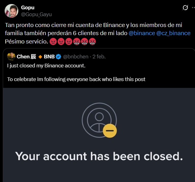 El descontento también alcanzó a usuarios que operan con cuentas familiares, como @Gopu_Gayu. Él señaló: «Tan pronto como cierre mi cuenta de Binance y la de los miembros de mi familia, perderán 6 clientes de mi parte. Muy mal servicio».