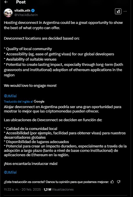 Buterin, reconocido por su influencia en el ecosistema digital, destacรณ en mensajes en la red social X la importancia de no permitir que el incidente de LIBRA daรฑe la reputaciรณn de la industria argentina de las criptomonedas. Asรญ que, propuso que el prรณximo evento DevConnect de Ethereum โun encuentro clave para desarrolladoresโ se realice en el paรญs suramericano, iniciativa que Milei recibiรณ con receptividad, al comentar que serรญa โun gran honorโ.