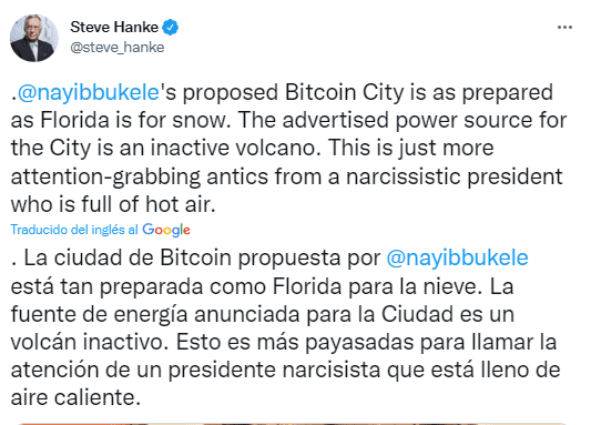 Hanke, profesor de economía aplicada en la Universidad Johns Hopkins en Maryland, EE.UU., publicó el tuit este viernes 7 de enero. En su comentario, Hanke insinuó la imposibilidad de usar un volcán inactivo como fuente de energía para el proyecto Bitcoin City, anunciado por Bukele el pasado 21 de noviembre de 2021.