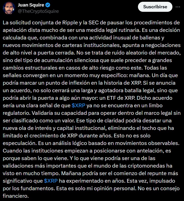 En este contexto, el influencer John Squire fue uno de los que avivรณ las especulaciones, al interpretar la pausa en las apelaciones como una seรฑal de negociaciones de alto nivel. Segรบn Squire, ยซla solicitud conjunta de Ripple y la SEC para suspender los procedimientos de apelaciรณn no es un trรกmite legal rutinarioยป, sino un movimiento estratรฉgico que, sumado a la actividad inusual de grandes inversionistas y movimientos en carteras institucionales, sugiere que un acuerdo podrรญa anunciarse pronto.