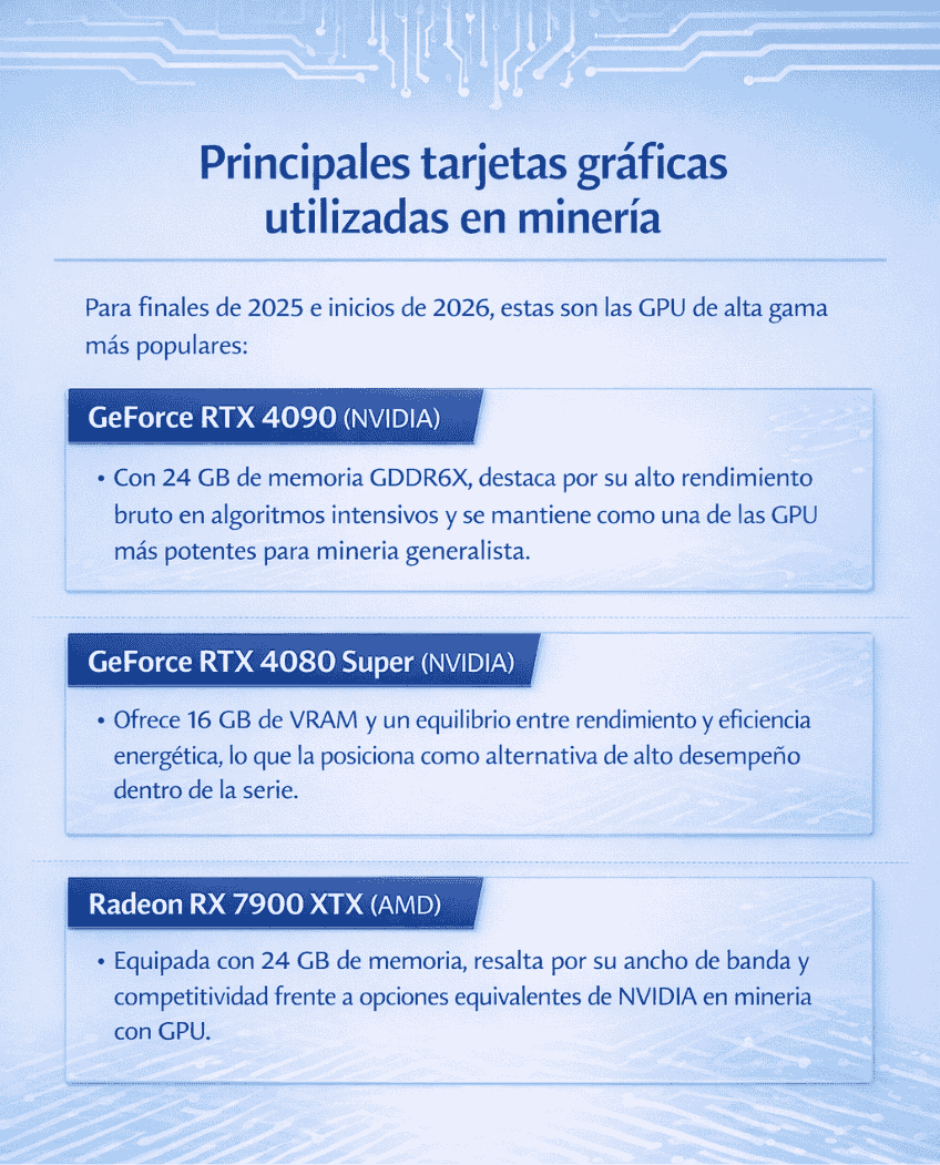 Para aprovechar al máximo esta capacidad, los mineros suelen construir rigs compuestos por varias GPU conectadas a una placa base, acompañadas de una fuente de alimentación y un sistema de refrigeración adecuado. Estos rigs pueden ir desde configuraciones modestas de 2 a 4 GPUs, pensadas para uso doméstico o experimental, hasta instalaciones semi-profesionales con más de 8 a 12 tarjetas.