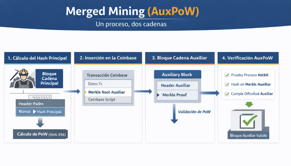 La minería fusionada no reemplaza el mecanismo de Proof of Work (PoW), sino que lo extiende a nivel operativo. El consenso PoW sigue cumpliendo su función central —ordenar transacciones y asegurar la red mediante trabajo computacional verificable—, mientras que AuxPoW permite que ese mismo trabajo pueda ser reconocido por más de una red compatible, sin alterar el diseño original del consenso.