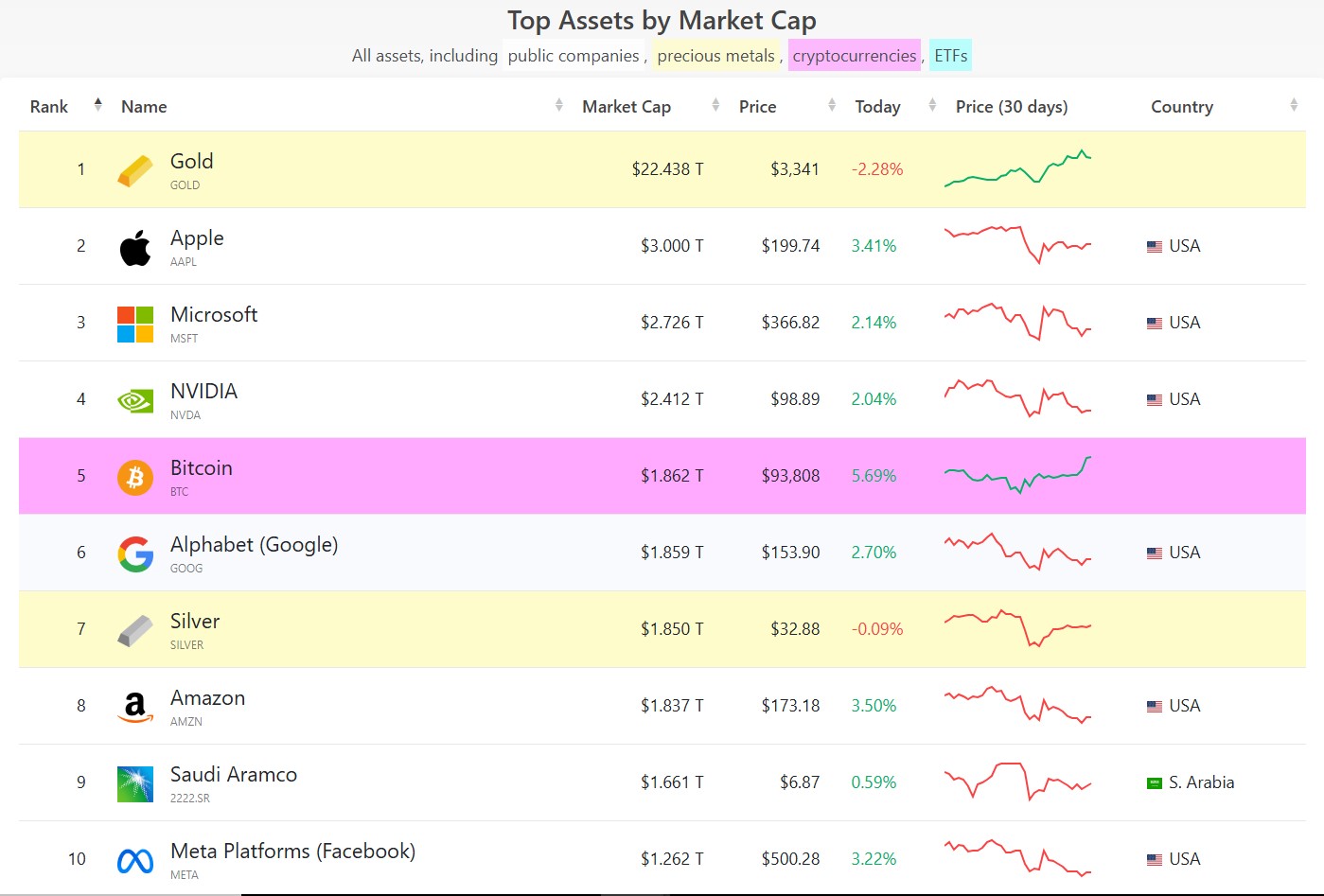 El gráfico de precio correspondiente a los últimos 30 días para los diez activos más valiosos del mundo está teñido de rojo. Está teñido de rojo para todos los activos excepto dos: el oro y bitcoin.