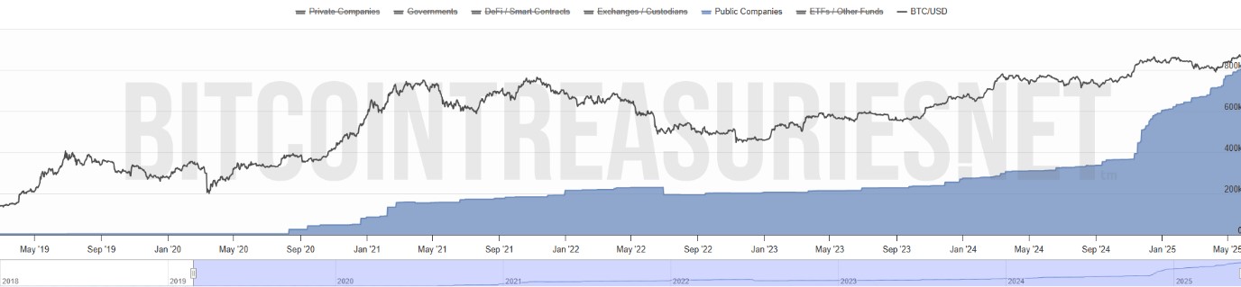 Puede verse que la tendencia fue bastante horizontal durante varios años, casi con Strategy siendo el único actor corporativo en constante acumulación, junto con unas compras esporádicas de Block y las compras puntuales de Tesla. Pero desde noviembre de 2024, coincidiendo con la elección de Donald Trump como 47º presidente de los Estados Unidos, la acumulación corporativa se disparó.