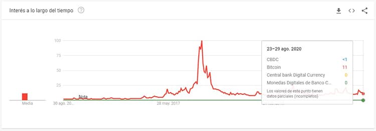 CriptoNoticias hizo una revisión directa en el sitio web para comparar las búsquedas de los términos «CBDC», «bitcoin», «Monedas Digitales de Banco Central», y Central Bank Digital Currency en los últimos 5 años. Los resultados muestran mayor número de búsquedas para la palabra Bitcoin. Ver gráfico a continuación: