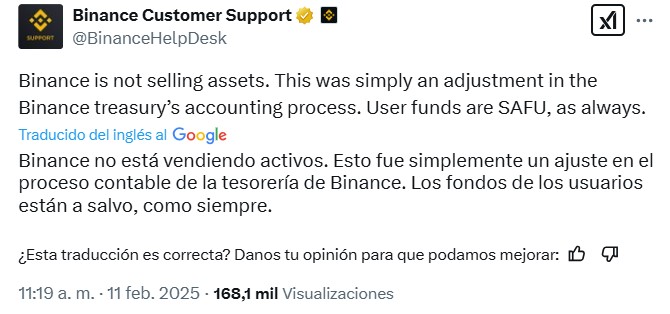 En una breve respuesta, Binance ha desmentido los rumores sobre una venta de bitcoins, aclarando que sus recientes movimientos fueron solo un ajuste contable en su tesorería y que los fondos de los usuarios están seguros. El anuncio fue publicado por su equipo de soporte en la red social X.