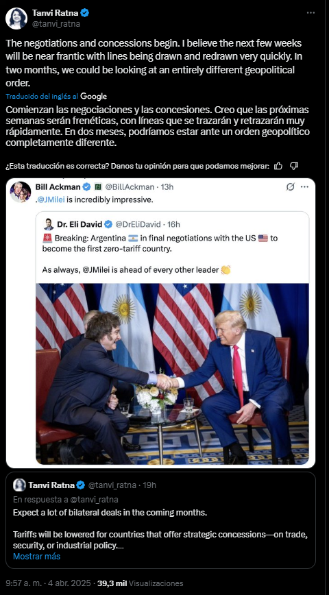 «Los aranceles ahora sirven como palanca para renegociar términos», sostiene Ratna, anticipando una ola de acuerdos bilaterales en los próximos meses. Los países que ofrecen concesiones estratégicas —en comercio, seguridad o política industrial— podrían ver reducciones arancelarias, mientras que aquellos que se resistan enfrentarán costos más altos hasta que cedan.