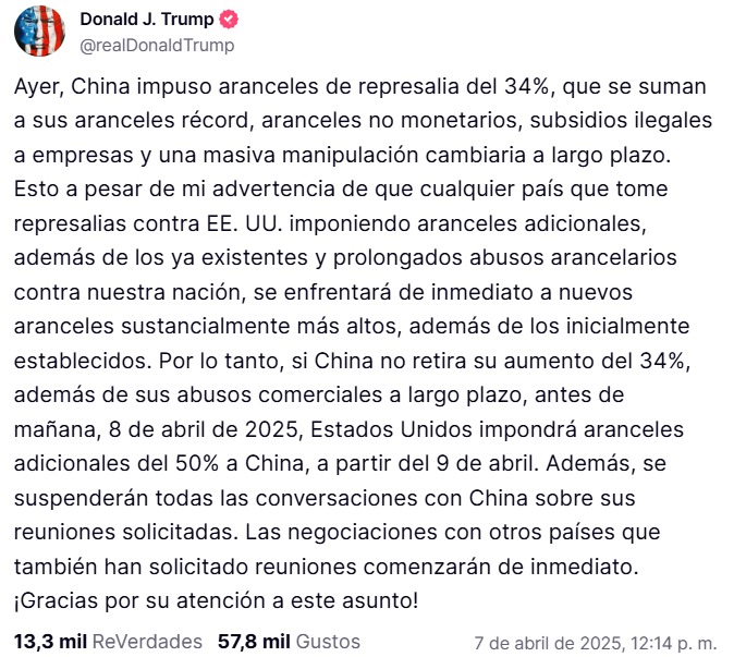 En concreto, representantes del gobierno de Xi acusaron a EE. UU. de llevar a cabo «medidas económicas de corte hegemónico disfrazadas de equidad». Sostienen que el gobierno de Trump busca obtener ventajas a costa de perjudicar a otros países… «Es como hacer un trato con un tigre por su piel: todos terminan perdiendo», señala un comunicado que, de acuerdo a medios locales, fue publicado por el organismo responsable de la actividad comercial.