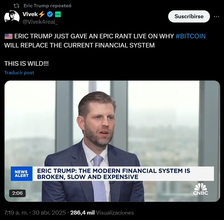 En una entrevista reciente, Eric Trump, hijo del presidente de Estados Unidos, afirmó que los bancos deben renovarse y adoptar las redes de criptoactivos si no quieren desaparecer en la próxima década. Según el empresario, «SWIFT es un completo desastre» y «no hay nada que blockchain no pueda hacer mejor que las instituciones financieras tradicionales». También comparó la situación de los bancos con la del cine o las cámaras analógicas, asegurando que están perdiendo relevancia porque, poco a poco, su función está siendo reemplazada.