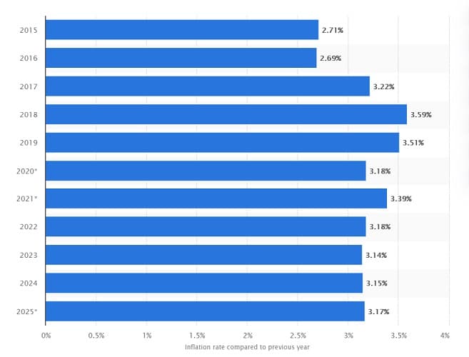 Por su parte, otras fuentes detallan que la inflación global de año a año fue mayor: ascendió a 3,39%. Sin embargo, esta cifra no difiere mucho del promedio actual de los últimos años (3,13%), ni tampoco de las proyecciones para los próximos (3,16%), como se puede apreciar en el cuadro de abajo.