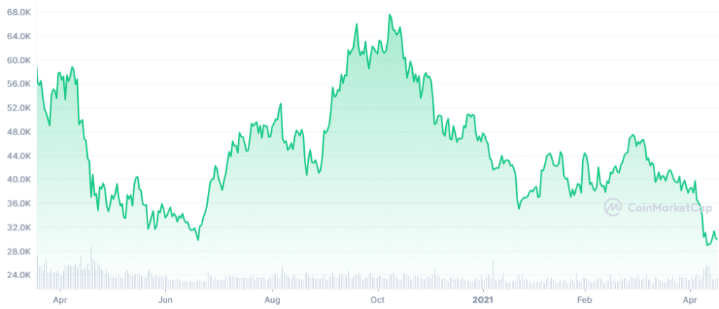 Esto se puede observar analizando el gráfico a continuación, que muestra el TVL de las DeFi en los últimos 12 meses, en comparación con el gráfico de precio de bitcoin. Cronológicamente, los descensos marcados de bitcoin y el TVL de las DeFi comienzan en abril.