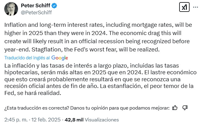 Incluso hubo una publicación sobre cuándo se declararía una hipotética recesión. Para el CEO de Euro Pacific Capital, el reconocimiento de la misma será inevitable antes de que termine 2025. «La estanflación, el peor temor de la Fed, se hará realidad», afirmó.