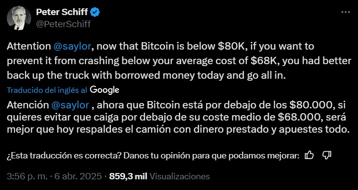 El CEO de Euro Pacific Capital, Peter Schiff, volviรณ a expresar sus opiniones en el marco de la guerra arancelaria impulsada por la administraciรณn Trump. Entre sus declaraciones mรกs llamativas, dirigiรณ un mensaje a Michael Saylor, lรญder de Strategy. Segรบn Schiff, si Saylor quiere evitar que bitcoin caiga por debajo de su precio promedio de compra โUSD 68 milโ, entonces deberรญa endeudarse y apostar todo ahora que la criptomoneda estรก por debajo de los USD 80 mil.