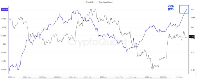 Con 35 millones de ether (ETH) en staking, la red Ethereum registró su máximo histórico en esa métrica el 18 de junio.