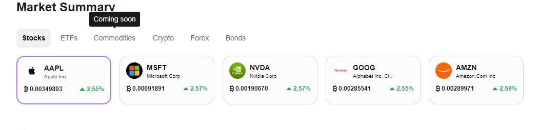 Por el momento, la plataforma Roxom no se encuentra operativa. En su sitio web, sólo ofrece un panel con el listado de las empresas con mayor capitalización de mercado. Todavía no fueron habilitadas las opciones de fondos cotizados en bolsa (ETF), Commoditties, entre otras. Si uno cliquea en una de ellas, aparece la leyenda “Muy pronto”.
