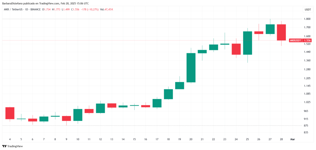 De este modo, MKR, que es el 59 con mayor capitalización, se encuentra ahora 75% debajo de su máximo histórico de USD 6.339. Tal hito fue alcanzado hace casi cuatro años, en mayo de 2021.