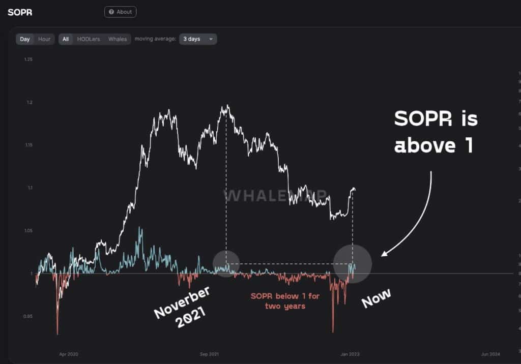 Por un lado, cuando el SOPR es mayor a 1, señala que en promedio las personas están vendiendo bitcoin con ganancias. Y, por otro lado, cuando el SOPR es menor a 1, demuestra que los inversionistas en promedio están vendiendo en pérdidas. Esto último es lo que prevaleció en el mercado bajista del último año, pero ahora cambió.