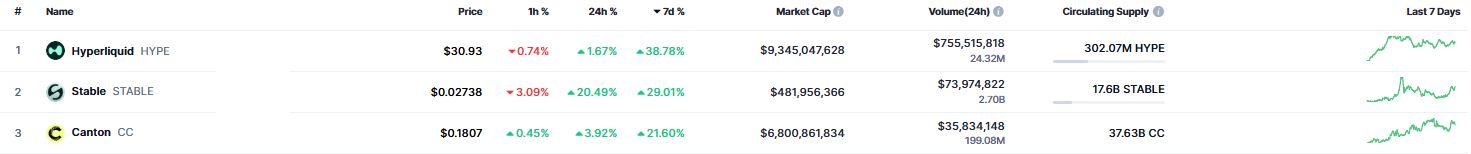 Sin embargo, hay tres activos digitales que están resistiendo a la caída general y registran ganancias. Se trata de hyperliquid (HYPE), stable (STABLE) y canton (CC).