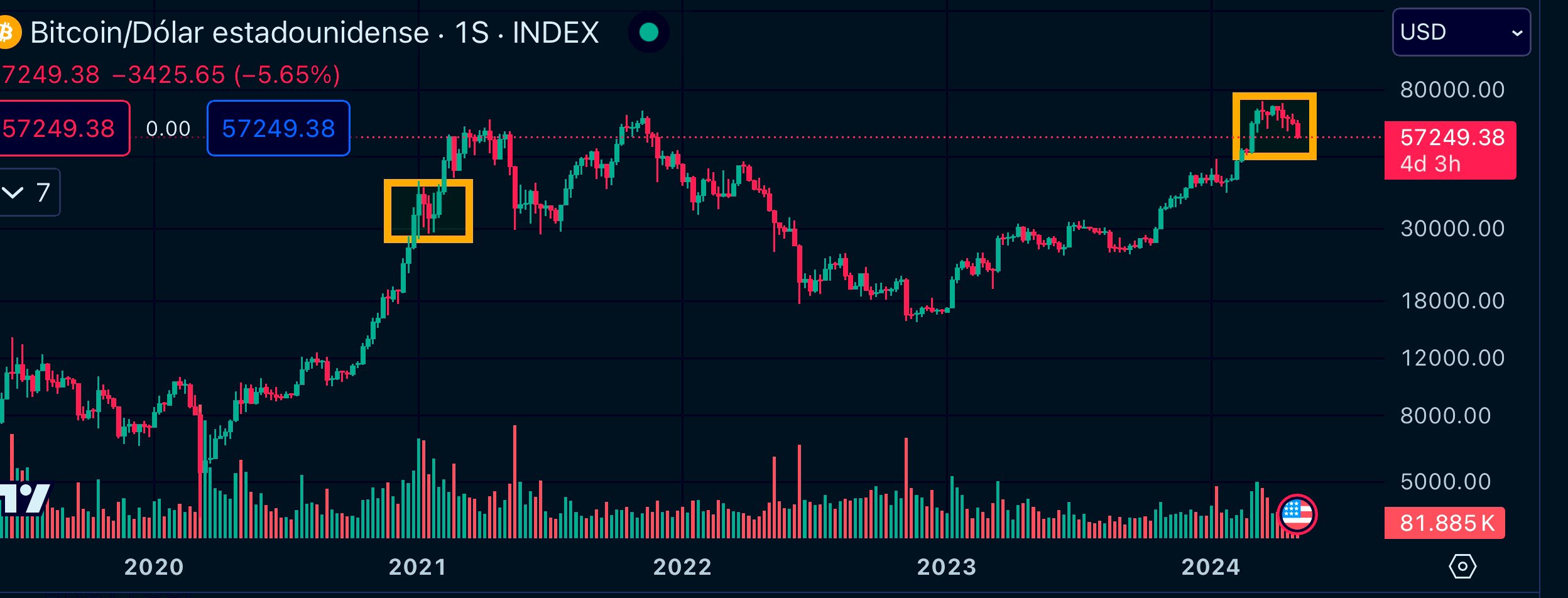 Advierte que la situación actual del mercado le recuerda cada vez más a la de marzo-abril del 2021. Profundizó que, en aquella época, bitcoin entró en un periodo lateral de consolidación después de una subida por meses, mientras las altcoins “volaban de una forma increíble”. Puede observarse esto en el gráfico a continuación.