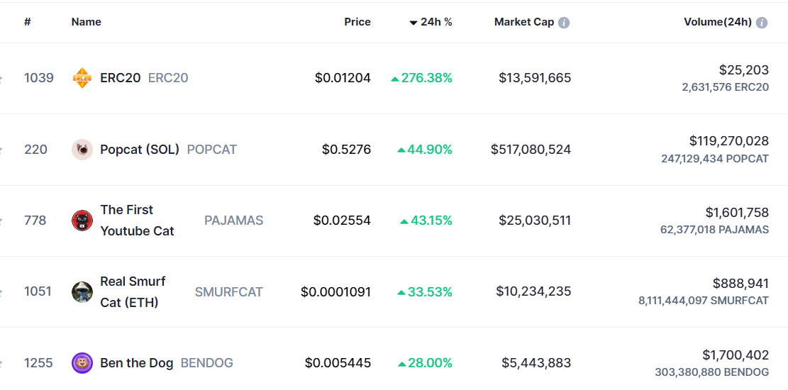 ERC20, ubicada en el puesto 1039 del ranking de capitalización, es la memecoin con mayor rendimiento en las últimas 24 horas de las 100 memecoins más grandes. Tal como muestra la siguiente tabla, esta registró en dicho periodo un aumento de 266%.