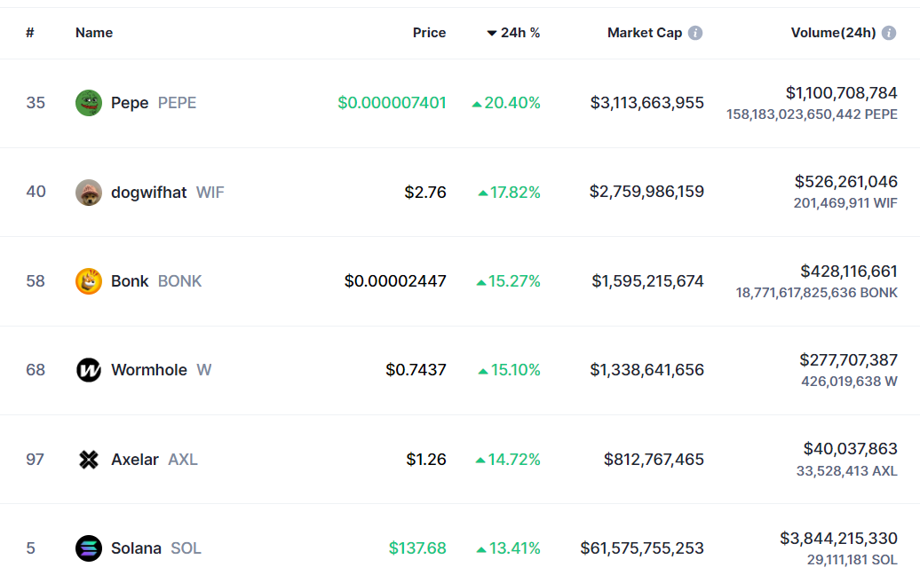 Como se exhibe a continuación, estas memecoins encabezan la lista con un aumento de precio cada una superior al 15% en las últimas 24 horas. Actualmente, PEPE se encuentra en el puesto 35 de los criptoactivos con mayor capitalización de mercado, mientras que WIF en el escalón 40 y BONK en el 58.