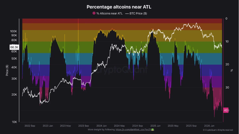 Entre el 38 y el 40% de las altcoins (criptomonedas sin contar a bitcoin) se encuentran cotizando cerca de sus precios mínimos históricos, de acuerdo con datos de CryptoQuant.