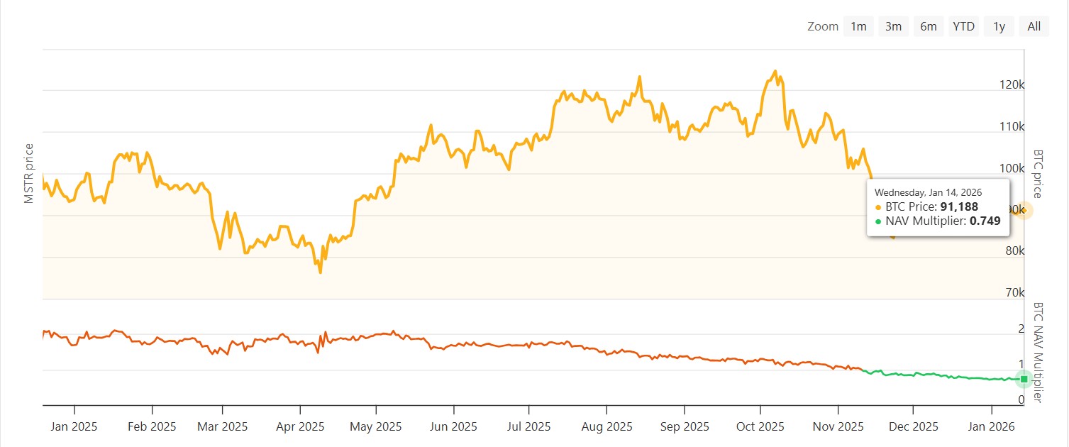 Un mNAV superior a 1 permite emitir acciones para acumular mรกs activos digitales; por debajo, esta capacidad se desvanece.