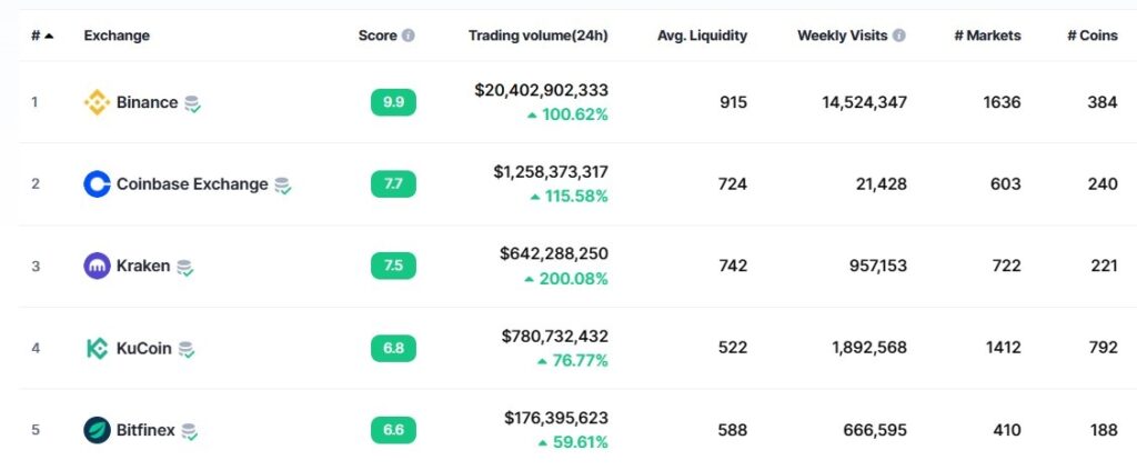 Al día de hoy, Binance es la plataforma de intercambio de criptomonedas (exchange) con mayor volumen de comercio global. En las últimas 24 horas registró USD 20.400 millones de trading spot, mientras el exchange que le sigue, Coinbase, hizo casi veinte veces menos, según CoinMarketCap.