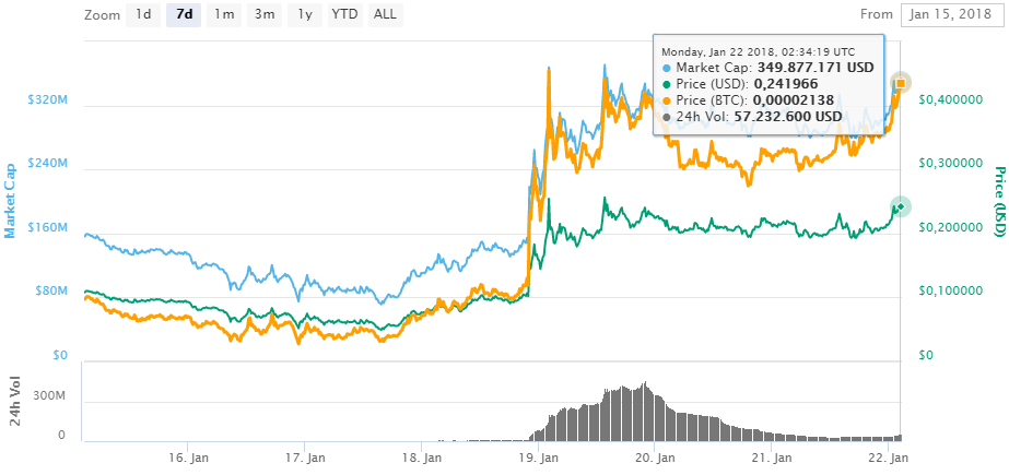 A inicios de la semana esta moneda presentaba un valor de 0,10 dólares y para el momento de la redacción es de $0,24, au aumento de más del 100%. Este aumento se presentó el 18 de enero y se debió a que el grupo de inversionistas de Palm Beach Confidential lo incluyó en su informe del mes de enero, el cual fue publicado el día 17.