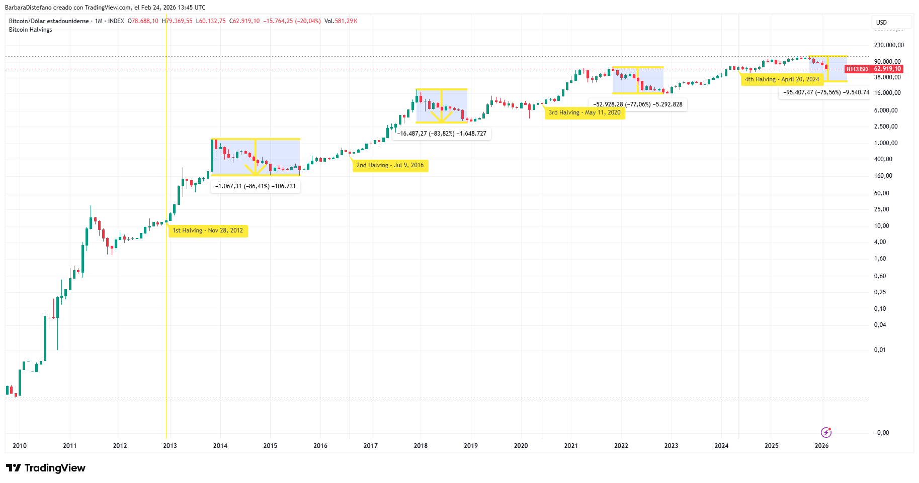 Al momento de esta redacción, como muestra la calculadora de CriptoNoticias, bitcoin cotiza en los USD 62.000. Eso es casi 50% debajo de su récord ocurrido de USD 126.000 marcado en octubre de 2025 al año siguiente del halving.