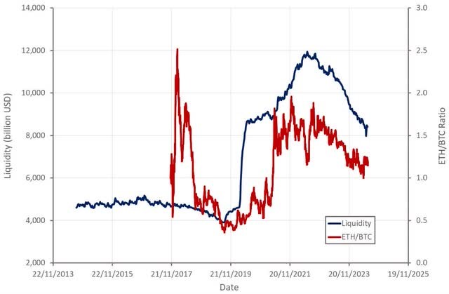 Puede distinguirse esto en el siguiente gráfico que exhibe la correlación entre la menor liquidez global y la caída del precio de ether (ETH) medido en bitcoin (BTC).