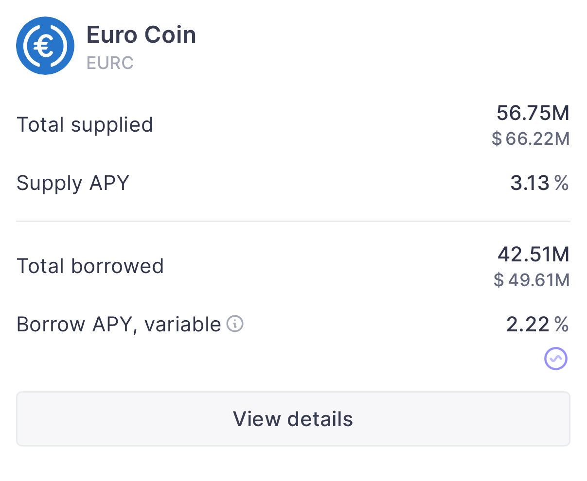 Hay 56 millones de EURC (Euro Coin) depositados en este protocolo.