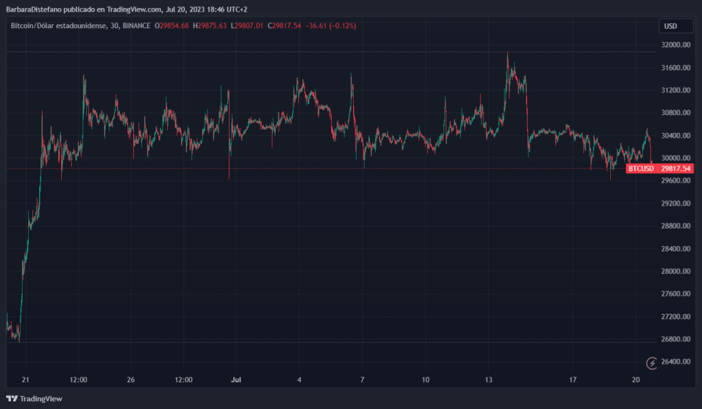 Durante el último mes, bitcoin ha cotizado mayormente entre USD 30.000 y casi USD 32.000, su máximo del año. De este modo, el mercado mostró fuertes niveles de soporte y resistencia en esas zonas.