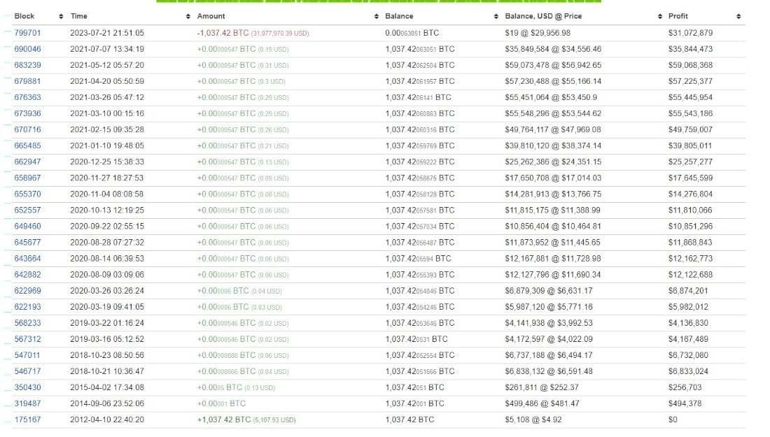 Después de haberse convertido en multimillonaria por la apreciación de BTC en estos 11 años, la ballena retiró 1.037,42 bitcoins de su wallet el 21 de julio de 2023. La operación se llevó a cabo mientras tal cantidad equivalía a USD 37,8 millones con BTC cotizando a USD 29.956.
