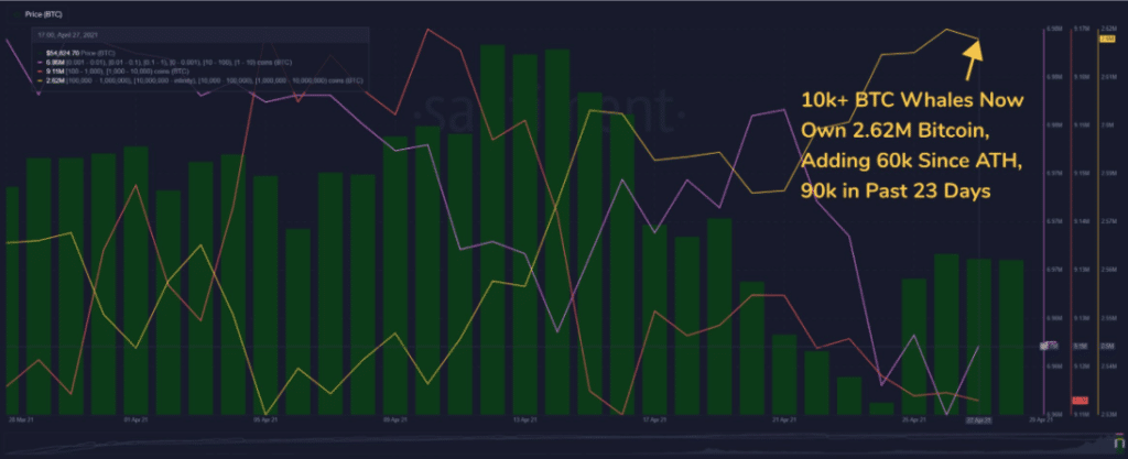 Los participantes del mercado, caracterizados por poseer mรกs de 10.000 bitcoins, acumularon mรกs BTC cuando el precio cayรณ por debajo de los USD 48.000 el 26 de abril. En 23 dรญas, estas ballenas aรฑadieron 90.000 activos mรกs a sus carteras, advirtiรณ Santiment, una empresa que analiza datos sobre la blockchain de la pionera de las criptomonedas.