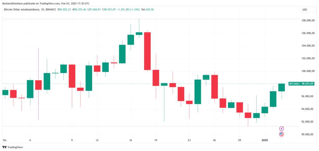 En este sentido, desde el banco no ven el reciente retroceso como el fin del ciclo alcista. Como exhibe el siguiente gráfico, bitcoin cotiza actualmente a USD 98.000, 10% debajo de su máximo histórico de USD 108.000 registrado hace dos semanas. Aun así, registra un aumento del 120% en el último año.