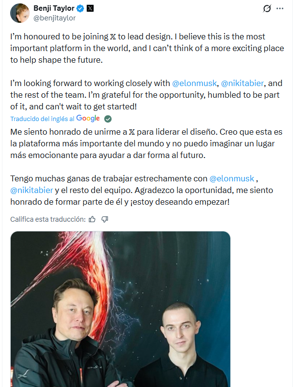 El propio Taylor confirmรณ su llegada con un mensaje publicado ayer, 25 de marzo, en su cuenta personal de X: โMe siento honrado de unirme a X para liderar el รกrea de diseรฑo. Creo que es la plataforma mรกs importante del mundo y no puedo imaginar un lugar mรกs emocionante para ayudar a construir el futuroโ.