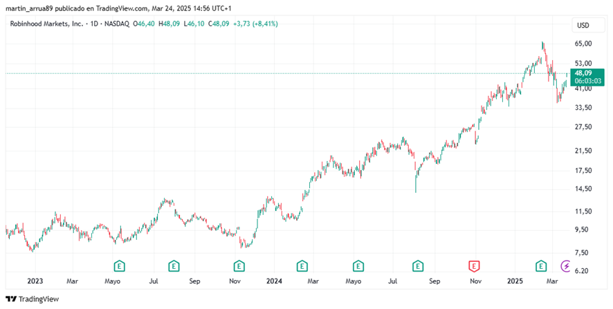 Por otro lado, el precio objetivo para HOOD se establece en 105 dólares, en comparación con su cotización actual de aproximadamente 48 dólares. Esto representa una subida superior al 100%.