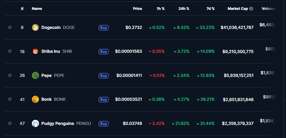 Por otro lado, BONK) y PENGU, ambas creadas en la red Solana, se ubican en cuarto y quinto lugar, con capitalizaciones de 2.800 y 2.300 millones de dólares, respectivamente. Sus precios actuales son 0,000035 dólares para BONK y 0,03 dólares para PENGU, mostrando incrementos del 29% y 31% en la última semana.