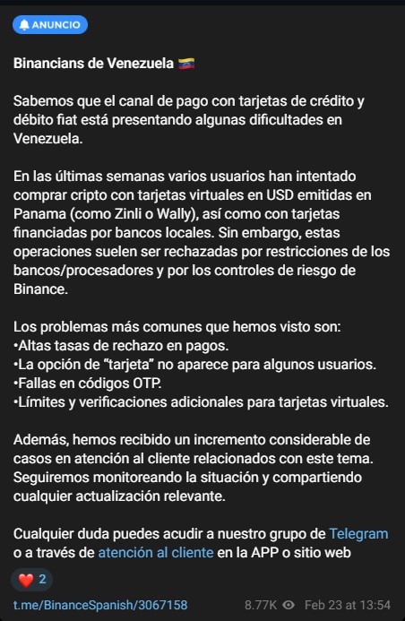 Segรบn un comunicado oficial emitido a travรฉs de sus canales comunitarios, las operaciones de compra de criptomonedas con tarjetas virtuales en dรณlares emitidas en Panamรก, tales como Zinli o Wally, asรญ como las financiadas por instituciones bancarias venezolanas, estรกn experimentando altas tasas de rechazo y restricciones operativas.