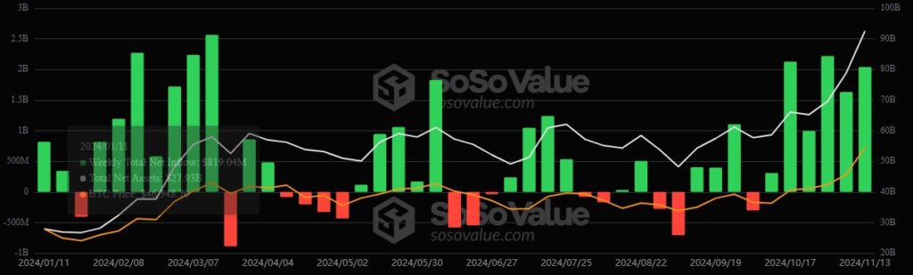 Paralelamente, el impulso reciente de BTC ha sido motivado por entradas masivas de capital hacia los ETF. Esta semana, estos fondos han acumulado al menos USD 2.000 millones, según los datos de SosoValue.