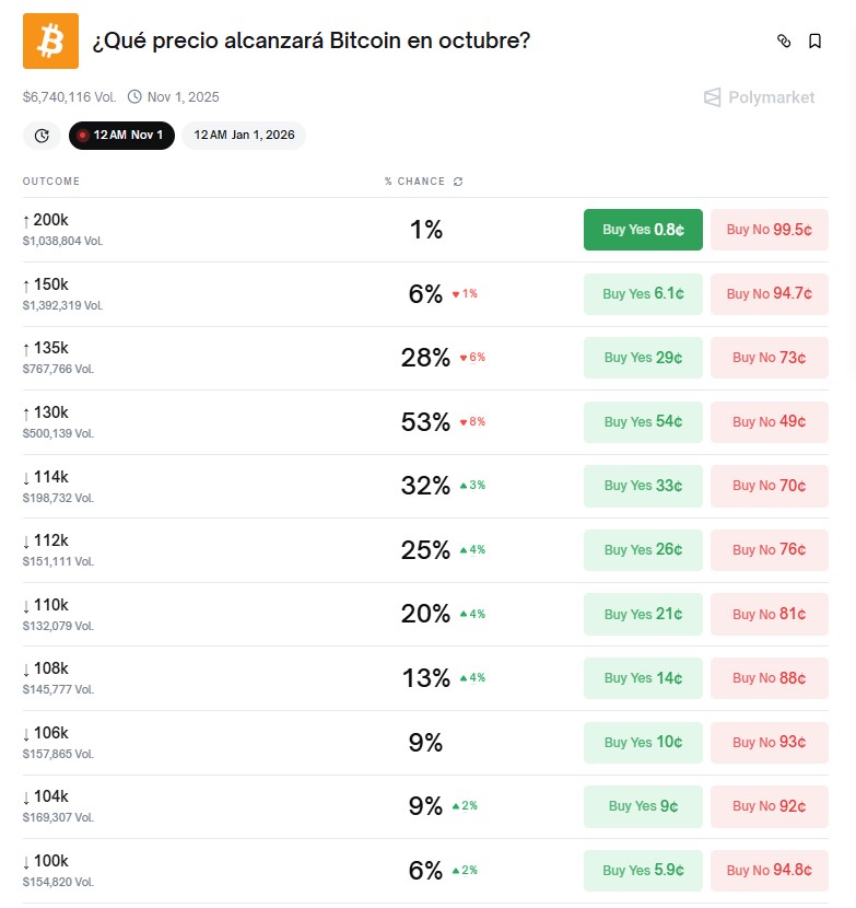En tanto, el nivel de los USD 135.000 este mismo mes cotiza en Polymarket con una probabilidad del 28%, según los apostadores de Polymarket. Asimismo, la estimación de USD 150.000 tiene apenas una probabilidad del 6% y la de USD 200.000, un 1%.