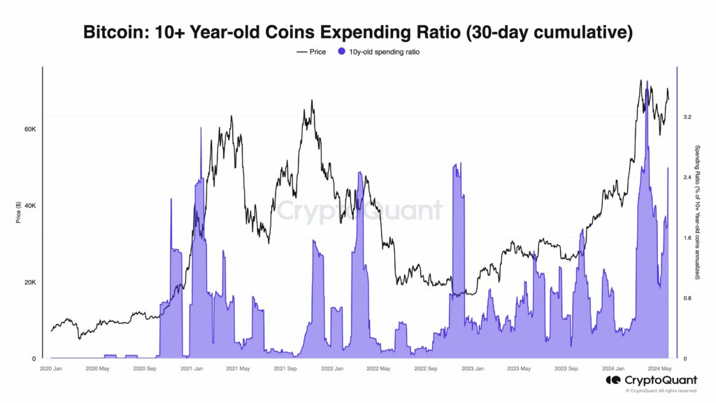 Cuando bitcoin subió por encima de USD 70.000 en marzo, inversionistas antiguos de la moneda aprovecharon para vender con grandes ganancias. De hecho, nunca antes se había vendido un porcentaje tan alto de BTC guardados por más de 10 años como en este ciclo, según datos de CryptoQuant destacados por Moreno.