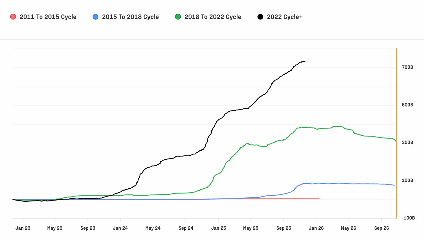 El actual ciclo de mercado de bitcoin (BTC) ha incorporado más de USD 730.000 millones en nuevo capital, superando la suma de todos los ciclos previos.