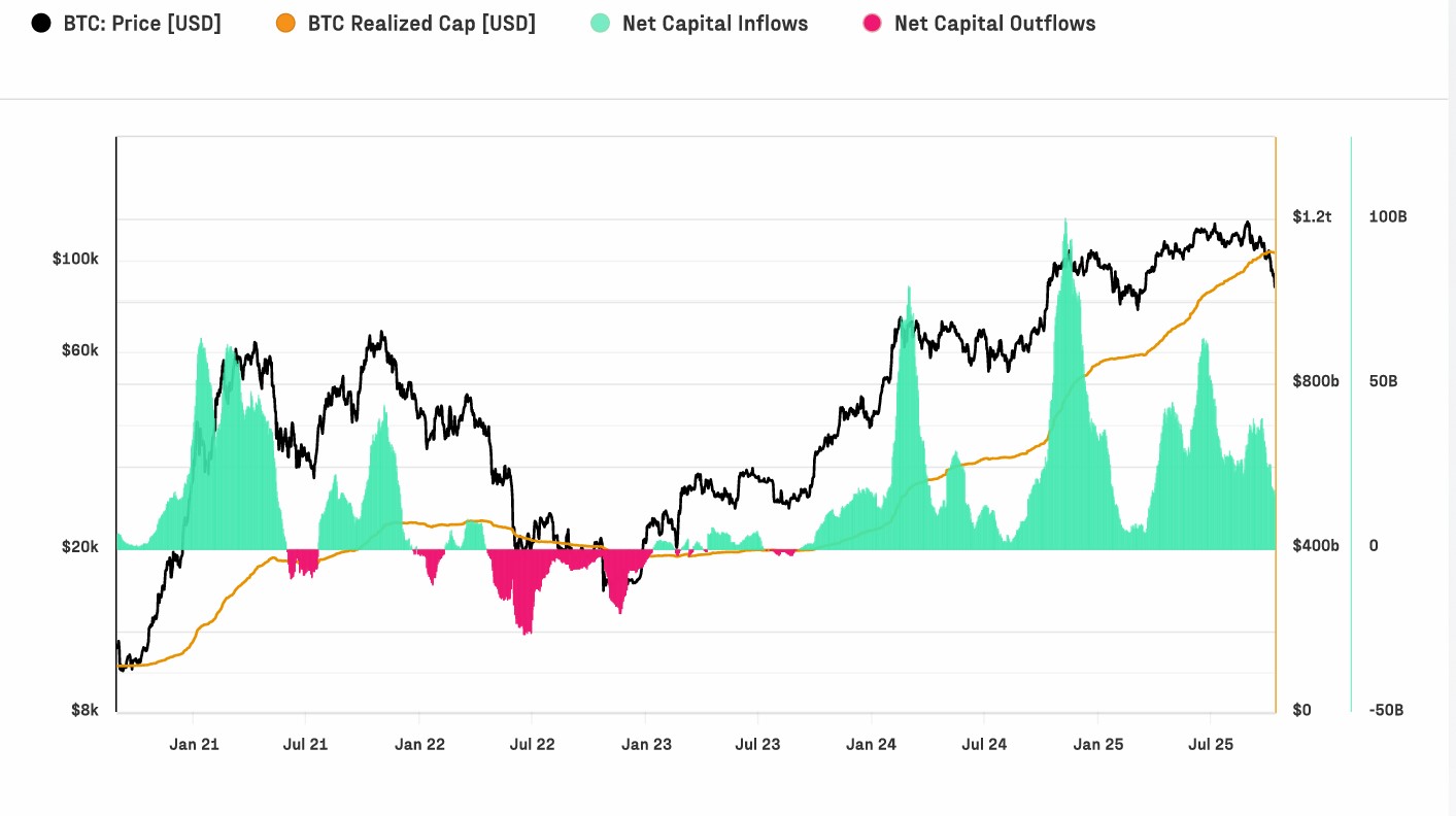 Asimismo, los flujos de dinero hacia BTC elevaron su capitalización realizada a un máximo histórico de USD 1,1 billones (trillions, en inglés). Estuvieron impulsados por entradas mensuales que llegaron a superar los USD 100.000 millones en sus momentos más intensos.
