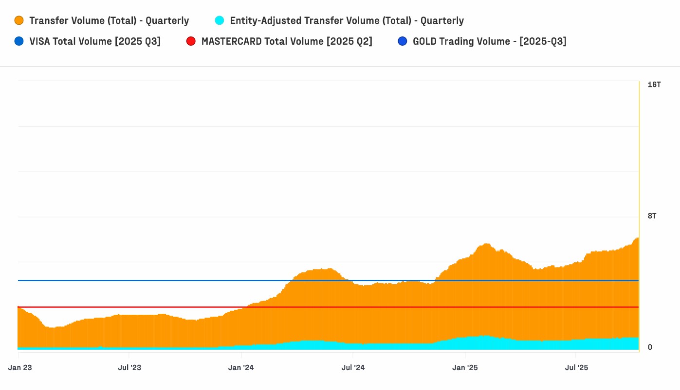 Pese a ello, en bitcoin continúa dominando la liquidación en cadena. En los últimos 90 días, la red creada por Satoshi Nakamoto procesó alrededor de USD 6,9 billones en volumen total (más que Visa y Mastercard) y USD 870.000 millones ajustados económicamente, tal como se aprecia a continuación:
