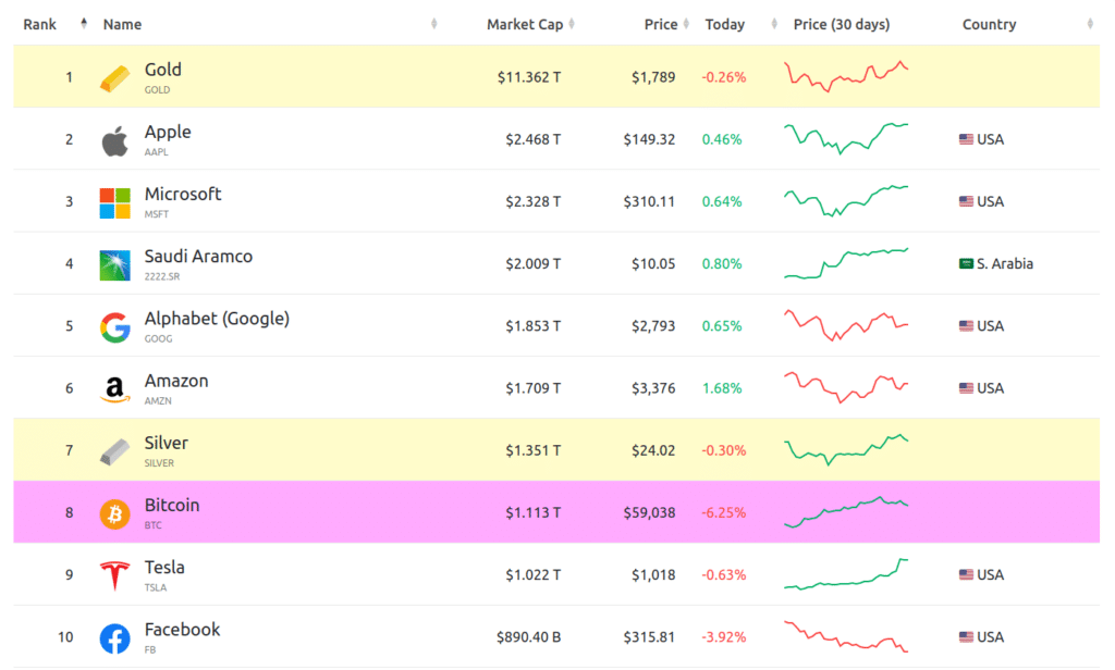 A pesar de la caída, Bitcoin se mantiene en octavo lugar en el selecto grupo de activos billonarios, superando la capitalización de mercado de compañías como Tesla y Facebook. El precio tendría que caer por debajo de los USD 54.000 para perder dicha posición.
