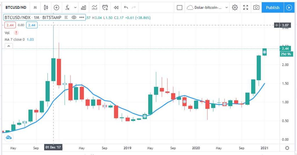 En cuanto a los precios de cierre mensuales, bitcoin también superó el máximo alcanzado en 2017 de su relación frente al índice Nasdaq, como se ve en el gráfico siguiente: